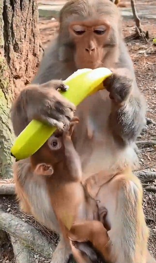 An adult monkey feeding while a baby monkey reaches out, learning through observation and interaction. Such scenes highlight the importance of social bonding, nurturing, and survival skills in primate communities. These behaviors mirror early human development and offer valuable insights into evolutionary biology and animal psychology.